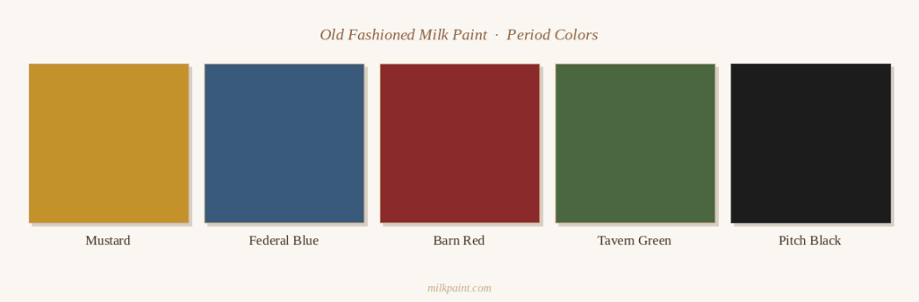 That tradition of painting the Windsor has never really stopped. I follow it. Every chair I finish gets a coat of Old Fashioned Milk Paint — the same powdered, water-mixed formula that has been made since 1974 from the same earth pigments and casein base that colonial craftsmen would have recognized on sight. My customers choose from the period colors: Mustard, Federal Blue, Barn Red, Pitch Black.