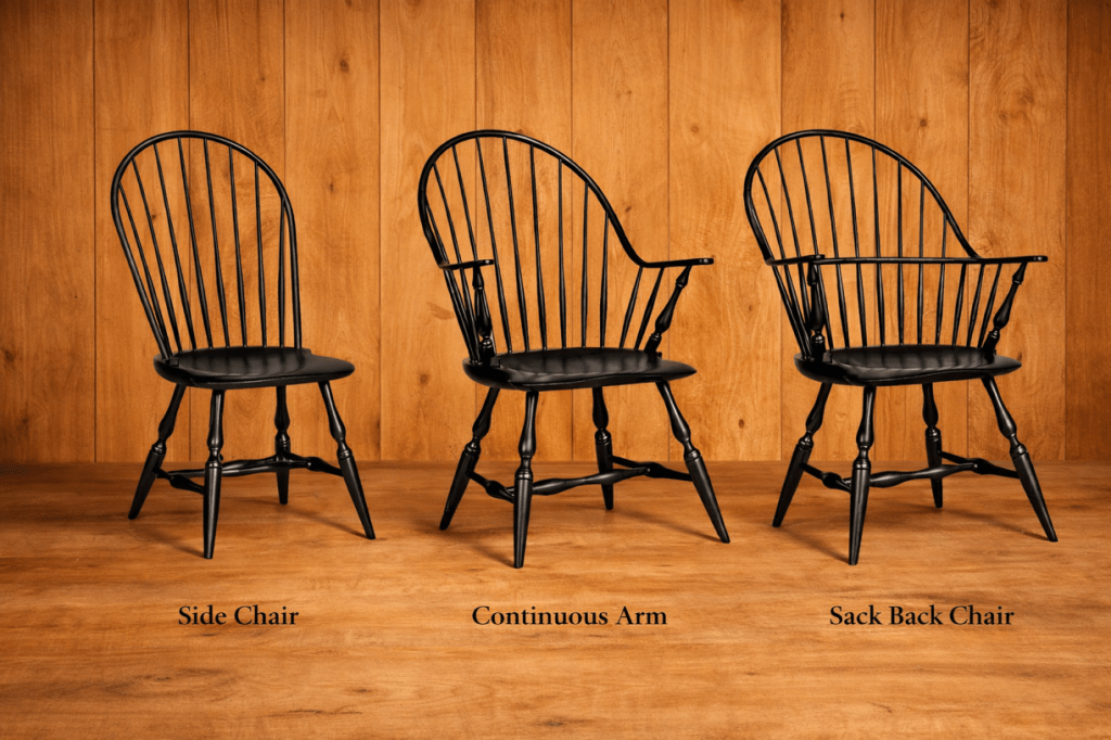 I make three types of Windsor chairs: the side chair, the continuous arm chair, and the sack back chair. Each style is available with two leg options, bamboo or ballister, and can be finished in a variety of traditional milk paint colors, shown below. If you are interested in ordering one or more chairs, please send me a message with the chair style you are considering, and we can discuss the options, availability, pricing, and timing. All chairs are made in La Grande, Oregon and must be picked up at this location, unless other arrangements have been made.